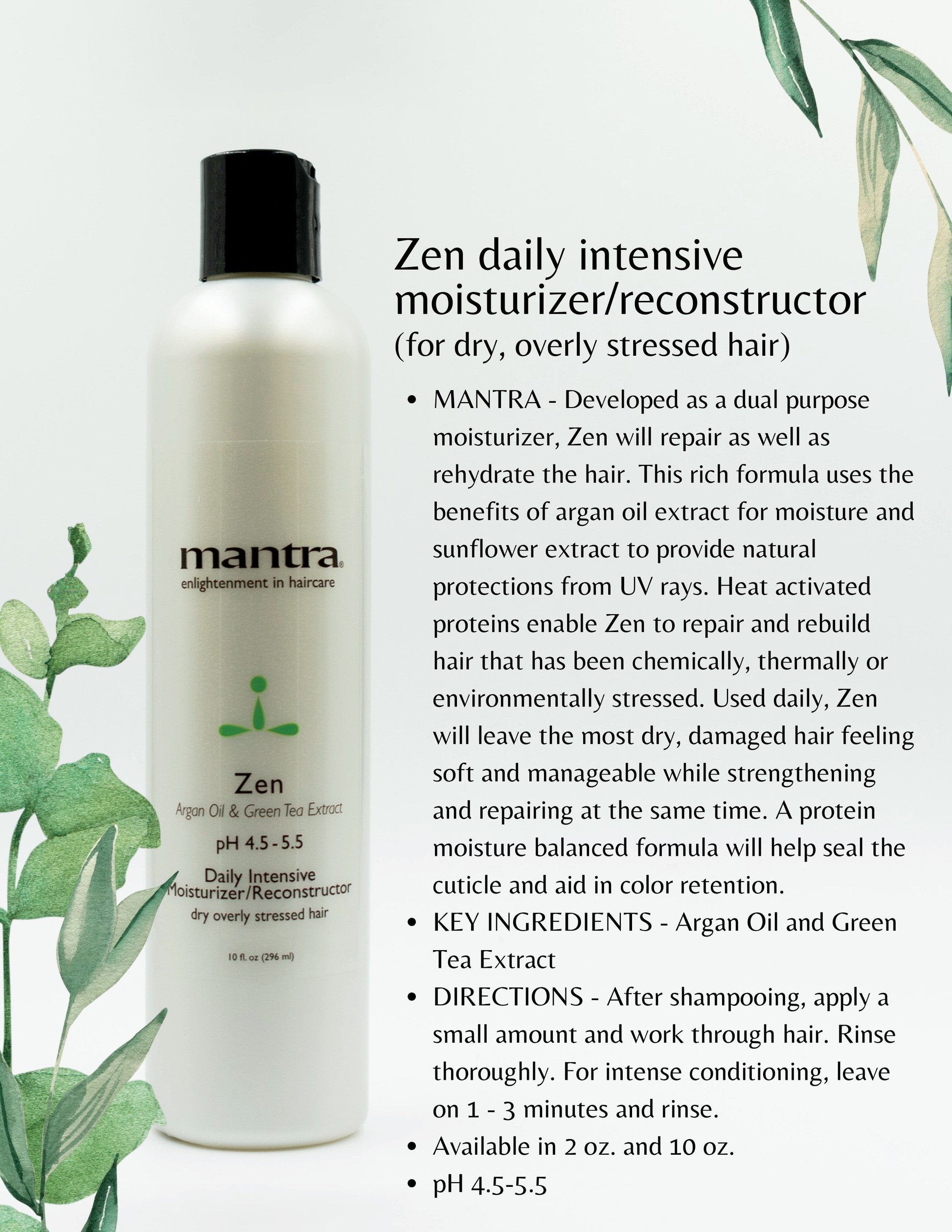- MANTRA - Developed as a dual purpose moisturizer, Zen will repair as well as rehydrate the hair. This rich formula uses the benefits of argan oil extract for moisture and sunflower extract to provide natural protections from UV rays. Heat activated proteins enable Zen to repair and rebuild hair that has been chemically, thermally or environmentally stressed. Used daily, Zen will leave the most dry, damaged hair feeling soft and manageable while strengthening and repairing at the same time. A protein moisture balanced formula will help seal the cuticle and aid in color retention.
